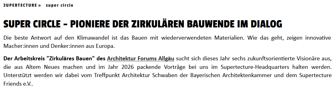 Super circle - Pioniere der zirkulären Bauwende im Dialog Die beste Antwort auf den Klimawandel ist das Bauen mit wiederverwendeten Materialien. Wie das geht, zeigen innovative Macher:innen und Denker:innen aus Europa. Der Arbeitskreis "Zirkuläres Bauen" des architekturforums allgäu sucht sich dieses Jahr sechs zukunftsorientierte Visionäre aus, die aus Altem Neues machen und im Jahr 2026 packende Vorträge im supertecture-Headquater […] |